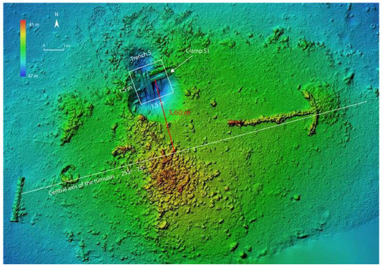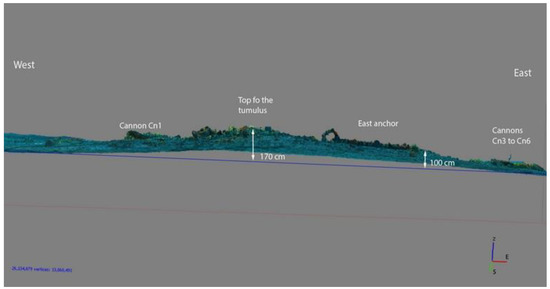 - The highest point of the tumulus is located at the top of the ballast stone pile, at 44.80 m. Its maximum thickness, in relation to the depth of the seabed, can be estimated at 1.70 m at its peak, with its lowest value at 1.00 m at the periphery (Figure 7).