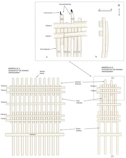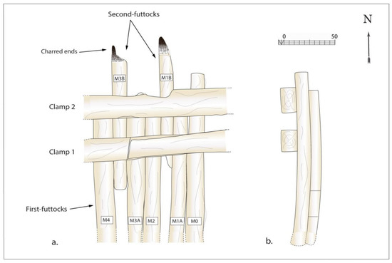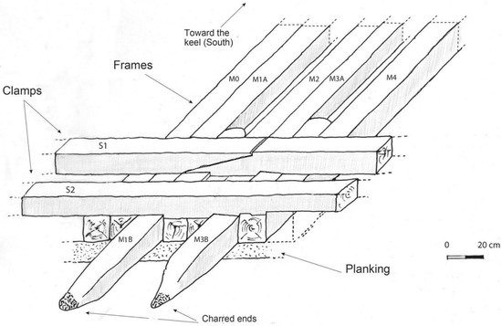 Seven timbers lay parallel to each other, placed in the transverse direction of the wreck with an overall north–south orientation. Interpreted as frames, they were named M0, M1A and M1B, M2, M3A and M3B, and M4 (Figure 9). Under them, the remains of the planking were observed. Finally, two timbers ran transversely over the frames. Interpreted as clamps, they were named S1 and S2, which would correspond to the fourth and fifth clamps (named starting from the bottom), reinforcing the assembly between the first and second futtocks. This assumption was supported by several factors.