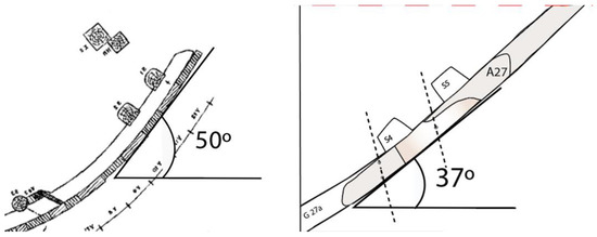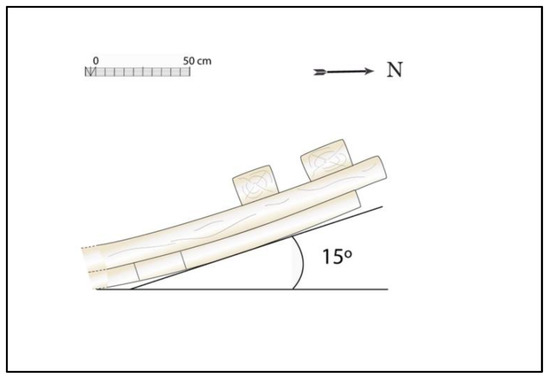 Finally, the architectural complex presents an inclination of 28% northwards, i.e., 15° from the horizontal (Figure 10). This slope is clearly very low in relation to the height of the assembly between the first and second futtocks.