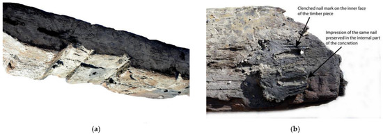 The surveyed area revealed an architectural complex corresponding to a portion of the charred end of the ship’s frames. Nine oak timbers appeared in the trench named the S area, which was opened up in a square of 1.5 × 1.5 m, on the northern periphery of the site, an area which, considering the shape of the tumulus, should be situated around the level of the ship’s maximum breadth (Figure 8).