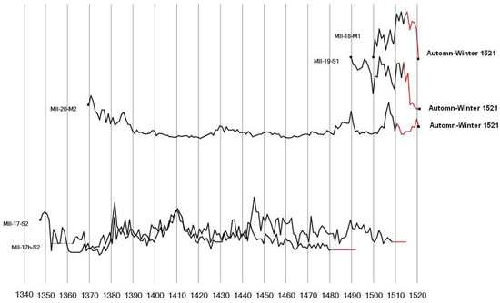 Another aim was to also undertake an observation of the hull remains, to characterize the type of construction. For this purpose, a trench was opened, in order to uncover a small portion of the hull. This was all the more necessary as the name of one of the ships, the Boscaina, appeared to have a potential eponym of Basque origin [3] (p. 207–208). It was therefore important to specify whether the shipbuilding tradition was of Mediterranean or Atlantic origin. This excavation also offered an opportunity to take wood samples for dendrochronology (see part 6).