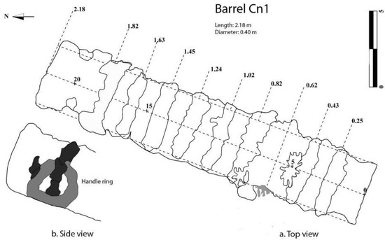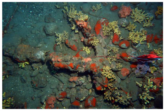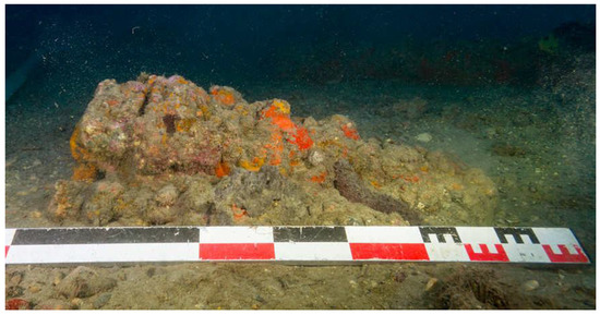 As at the Mortella III site, the artefacts visible at the Mortella II site are mainly represented by wrought iron artillery pieces with hoops: six tubes and five breeches; one large anchor of 3.95 m and a small incomplete one with an estimated initial length of 2.55 m (±65 cm); ceramic shards: mainly earthenware, organic artefacts represented by ropes, most of them burnt, a little cask, and a bovine bone found in the upper part of the tumulus; various unidentified artefacts.