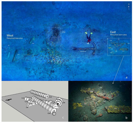 The archaeological and historical interest of this operation led to the collaboration of several European institutions and research organizations—about fifteen in all—and researchers from various disciplines. It benefited from the scientific collaboration of the Spanish National Research Council (CSIC); the ForSEAdiscovery Consortium [5,6]; the Projet Commun de Recherche (PCR. i.e., Joint Research Project) ‘16th Century Ship’, which brings together, among others, the Groupe de Recherche en Archéologie Navale (GRAN), France; Centre d’Études en Archéologie Nautique (CEAN), France; Spanish National Research Council (CSIC), Spain; Sorbonne University, France, Università di Sassari, Italy; and Università di Genova, Italy. The project was carried out with the financial support of the French Ministry of Culture (DRASSM), the Collectivité de Corse (CdC), the European Union (Marie Sklodowska Curie Actions, Horizon 2020), and the Spanish National Research Council (CSIC) through its PIAR fund (Proyectos Intramurales para Arqueología en el exterior).