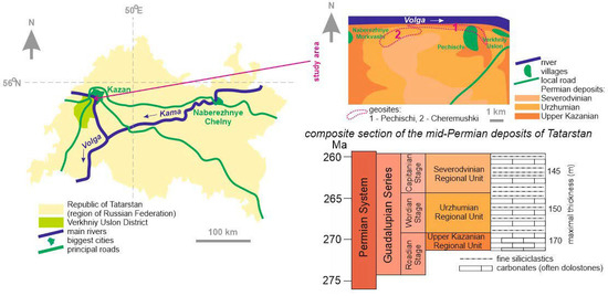 Due to its significant territory and outstanding geological diversity, Russia boasts a particularly rich geoheritage [29], which often has major international importance. For instance, this is the case of the Volga River watershed, where the Permian System was established more than 150 years ago [30,31,32]. Those developments laid the foundations for subsequent development of the regional standard of this system’s subdivision into series and stages [33,34,35]. The related geological objects are not only valuable historically, but they are of major importance for the present-day research and are sites of national pride. In other words, these are outstanding geoheritage sites (geosites). Some are located in the Republic of Tatarstan, which is a large region of the Russian Federation in the middle portion of the Volga River watershed [29,36]. Therefore, their systematic description with the use of cutting-edge approaches to geoheritage assessment seems to be urgent task.