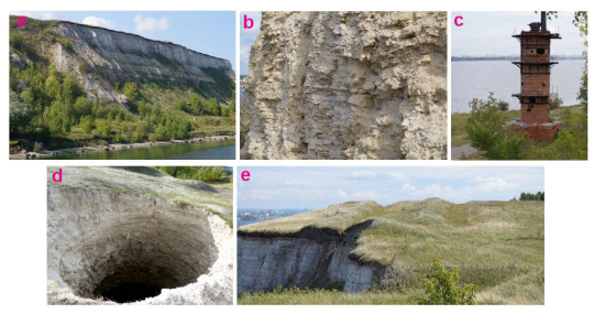 Pechischi geosite: (a) general view of the Upper Kazanian section, (b) Upper Kazanian dolostones, (c) abandoned oven, (d) karst sinkhole, and (e) combination of karst and landslide phenomena.