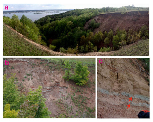 Cheremushki geosite: (a) general view of the Urzhumian section exposed in the gully; (b) Urzhumian red fine siliciclastics; (c) paleosol horizons (indicated by red arrows; a bag in the lower right corner is provided for scale).