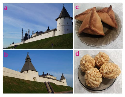 The Kazan Kremlin: (a) general view of the UNESCO World Heritage Site; (b) details of the Kremlin’s wall; food heritage of Tatarstan: (c) echpochmak and (d) chak-chak.