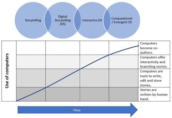 In the digital era, storytelling derives its engaging power by integrating images, music, narratives, and voice, thereby giving a deeper dimension and vivid color to characters, situations, experiences, and insights [5]. Computers have been involved in the creation, storage, reproduction, sharing, and publication of stories. Initially, they were just side tools, but advanced and complex algorithms over a constantly and exponentially growing processing power brought them closer to the generative procedure of story-making. Stories also became interactive; listeners could intervene in their flow and decide, to some extent, how they would unfold. This is how the term of the narrative paradox came up; the freedom of choice in the formation of the story, as opposed to its prefabricated plot by the author. The user interaction with the medium conflicts with the narrative design [6]. Thus, there is always a tension between the story and freedom [7] and a balance has to be established to preserve the internal consistency of the story. Rules and boundaries are necessary to maintain the story trajectory and end up communicating messages that are desirable—as originally defined by the author—and not unpleasant.