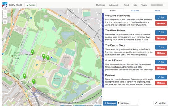 In another field approach, Womack and Freeman [82] presented a novel method for creating interactive narratives. Based on the literature approach for narratives, they considered that stories have genre and semantics and they added location-based context. Using a GPS geo-location, they try to anchor stories to the real world. The narrative structure is anchored to various locations, and they use a database of words, sentences, and phrases to select their data through machine learning procedures. Location data are also important in StoryPlaces (Figure 3). It is a platform presented by Hargood et al. [40] and focuses on locative narrative systems. Research in the field had been abandoned for some time, but the authors returned with an “open-source locative hypertext platform and authoring tool designed around a sculptural hypertext engine and built with existing Web technologies”. In other words, StoryPlaces can be used as an authoring tool for narratives that embed locative data and it has been tested and used in actual applications.