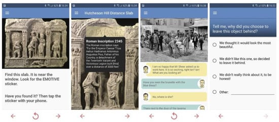A practical tool created to assist storytellers was presented by Vrettakis et al. [28]. The authors described the web-based Narralive Storyboard Editor (NSE) and the Narralive Mobile Player (NMP) app (Figure 4) as “developed with the objective to assist the creative process and promote research on different aspects of the application of mobile digital storytelling in cultural heritage settings”. These tools were developed during the implementation of the CHESS project [29,124] (CHESS authoring tool) and afterwards they were upgraded, altered, and used in the EMOTIVE project [125]. Narralive has no emergent storytelling elements but can speed up the writing of stories through templates. In a later project [42], the authors created an authoring tool called The Story Maker and experimented on previous works with branching narratives in cultural heritage. In the said project, they presented their tool which aims to foster the development of multimedia interactive narratives for cultural heritage. It is a web-based, JavaScript tool which contains two parts; the story design editor (SDE) for designing the story and the storyboard editor (SBE) that produces the final visitor experience.