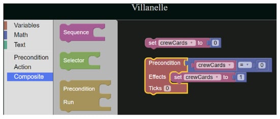 For the rest of the projects in the Game category, different proprietary approaches were followed. Bhide et al. [111] experimented on virtual reality games and analyzed the spatial sound serving the storytelling. Adversario [62] is an implemented system for creating interactive narrative games where autonomous agents are guided by an adversarial planner which conflicts with player goals. The world and agents are created procedurally and interaction with users occurs via a text interface. Cardona-Rivera et al. [101] attempted to formalize the narrative design for games, using a method called GFI (Goals, Feedback, Interpretation). The GFI framework attempts to bridge the gap between narrative design, game development, story analysis and game research. The authors also attempted to elucidate the potential of GFI as a general method for creating game narratives. Martens et al. [45,46] presented a more advanced authoring tool called Villanelle (Figure 5) which automates the creation of characters for storytelling. Their approach is language-based and they created algorithms using behavior trees (BT). The authors chose BTs because of their wide adoption in the game industry by designers. Villanelle is an API framework but also a standalone tool to author every part of an interactive narrative experience. Finally, as discussed above, Novella [17] is a DS authoring tool that targets video game stories.