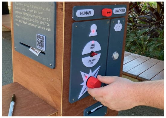 Vim [65] is a tangible interactive narrative about energy (Figure 8). According to the authors, “it is designed to illustrate how a story about a public issue could be designed for physical interaction and whether that interaction can encourage participation in that issue”. Vim is a wooden box with buttons and switches that includes a variety of technologies (like a thermal printer and cellular network connection) that print a story for the user according to his options. The main theme of the story is energy and there is a question for each reader to answer.