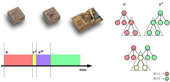 S can be employed by the interactive tool/application to switch between different time-periods, by means of user input (e.g., a slider). A given context may present areas or portions having different pacing from a temporal perspective; for instance, a portion of the 3D scene that did not evolve during multiple time-periods. Temporal instancing [] can be adopted to share sub-graphs of representation models (see Figure 2), with two major advantages: (A) a compact memory footprint during interactive inspection and (B) caching that minimizes the online transmission of 3D data for representation models (Web3D applications).