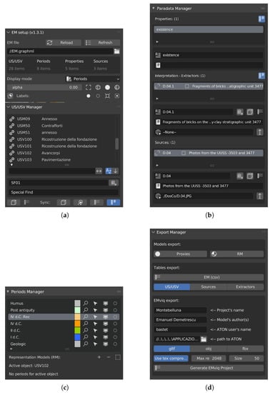 For the sake of this research, we will focus on the export manager panel (see Figure 3d), which represents the main improvement of the EM 1.3.1. It allows the export of Proxy models and representation models divided into sub-folders according to their chronological period along with the GraphML file and the JSON file describing the EMviq 4D scene. Through this tool, it is also possible to export in csv format the list of stratigraphic units with their chronological belonging and descriptions, sources and extractors to edit tables for publication or raw data export functionalities.