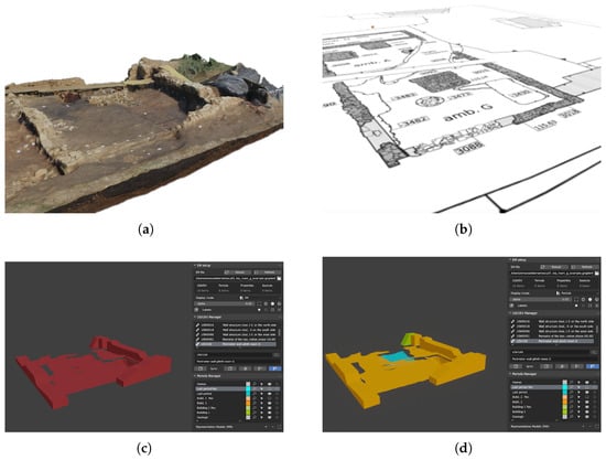EMtools workflow steps 1 and 2. (a) Imported photogrammetric model. (b) Archaeological plans. (c) 3D modelling of the proxies (only real stratigraphic units) in EM color schema. (d) Epoch color schema.
