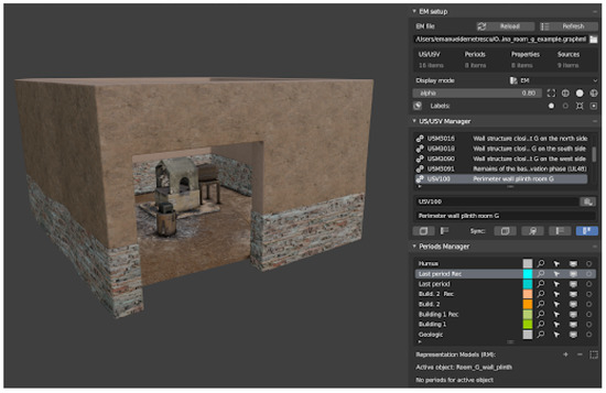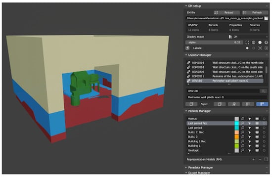 As regards the creation of the reconstructive record and in particular the adoption of specific semantic tools to describe the scientific processes behind the reconstruction, in the last 10 years different approaches have been proposed, each with a specific focus; in some cases, starting from previous semantic tools such as CIDOC-CRM [,] or proposing a minimum set of information able to describe the reconstruction process along with an online service to annotate them [,] or in other cases proposing a new formal language (CONML) []. There are projects focused on the transparency of the data behind virtual reconstruction, by means of virtual reality experiences, based on closed software solutions such as Unity 3D []. Within the scientific community, the Extended Matrix project (Zenodo project page: [], official web site: []), on which the present research is based, is attracting a growing interest. The extended matrix is an open formal language, entirely based on open source software and formats to ensure full repeatability and FAIR dissemination of the results. The EM can be used to keep track of virtual reconstruction processes and, more in general, of the interpretation processes during the scientific tasks of analysis and synthesis. It starts from standards already used for the collection of the stratigraphic record (physical and chronological description of artifacts) in the archaeological field work or in building archaeology. It is intended to be used by archaeologists and heritage specialists to document their scientific activities in a robust way. The EM allows us to record the sources used and the processes of analysis and synthesis that have led from scientific evidence to virtual reconstruction. It organizes the 3D archaeological record so that the 3D modeling steps are smoother, transparent and scientifically complete (for a detailed description of the formal language of the extended matrix, see [,,]). There are also other attempts to involve stratigraphic aspects into the formalization of a virtual reconstruction that shares some basic aspects with the EM approach [].