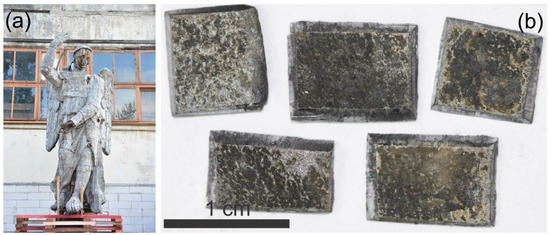 (a) Sculpture of an angel, showing intense corrosion features (photo provided by the Nasledie Ltd. restoration workshop). (b) Macro-photo of lead plate fragments.