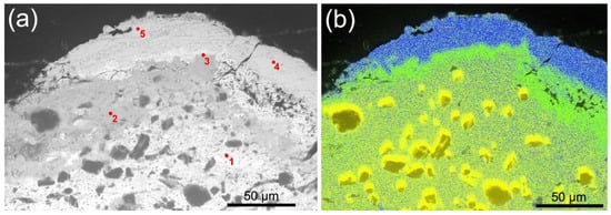 (a) SEM image of the cross-section, numbers correspond to analysis listed in Table 2. (b) SEM-EDX map of the same area, showing the distribution of chlorine (green), sulfur (blue) and silicon (yellow).