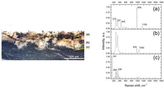As it can be seen from Figure 1b, corrosion layers differ in color. Each of the observed layers was studied by Raman spectroscopy (Figure 3). The top layer has shades from brown to black. A typical spectrum from this area is shown in Figure 3a. Its characteristic feature is the presence of an intense peak with a maximum at 976 cm−1, which is interpreted as the peak ν1 of the totally symmetric vibration in SO42− in anglesite [18,19,20]. Additional confirmation of the anglesite presence is the detection of bands, corresponding to vibrations ν2 (at 445 cm−1), ν3 (1155 cm−1) and ν4 (608 and 640 cm−1) [18,21]. The Figure 3a spectrum also shows peaks at 272 and 327 cm−1. Their intensities change concurrently but independently of anglesite peaks and, as the Figure 3b spectrum shows, they become dominant in areas with the white color. This pair of peaks is consistent with the chlorine-containing mineral laurionite. For this mineral, crystallizing with the orthorhombic space group Pnma, the peak at 327 cm−1 was assigned to phonons with the symmetry of the irreducible representation of Ag and B2g, and the peak at 272 cm−1 to B1 and B3g [22]. Additionally, the spectrum Figure 3b shows peaks at 976 and 1050 cm−1. The 976 cm−1 peak refers to anglesite, while the 1050 cm−1 peak is interpreted as the totally symmetric vibration of ν1 in the CO32− ion in hydrocerussite or cerussite [23]. Overall, comparison of the spectra clearly indicates that the white area (Figure 3b) contains significantly less anglesite than laurionite as compared with the brown area (Figure 3a). The presence of the chlorine-containing mineral laurionite in the white region, as well as small amounts of hydrocerussite, is consistent with SEM-EDX data.