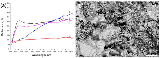 Spectral reflection coefficients were measured for the different color areas of the surface. The reflectance spectra for the original metallic lead (1) and corrosion layers of white (2), yellow (3) and black color (4) are presented in Figure 4a. To investigate the original metal surface, one of the fragments was immersed for 5 minutes in an EDTA (Ethylene Diamine Tetra Acetic, C10H14N2Na2O8·2H2O) solution, pre-heated to 90 °C. Due to two hundred years of outdoor exposure, the sculpture’s metal had degraded and formed a unique texture, which is hidden by corrosion deposits. Figure 4b shows a SEM image of this surface, where corroded metal has gained a spongy structure. The curve №1 in Figure 4a corresponds to the reflectance spectrum of this surface.