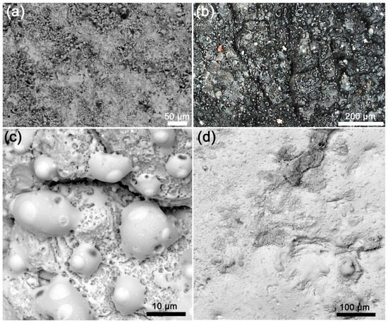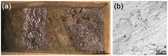 In a corrosion layer irradiation, a slight darkening was observed at 0.2–0.3 J/cm2. This darkening was associated with the formation of dark globules, as in the case of μs pulses. Increasing the number of pulses or wetting did not lead to surface cleaning. At 0.4 J/cm2 and above, together with the darkening of the surface, a partial cleaning occurred and the metal in the cleared areas was melted. With fluence above 0.53 J/cm2, the percentage of cleaned surface was increased; however, the cleaned-to-metal areas acquired a bluish tint. As a result of further laser fluence increase (to 1.2 J/cm2, Figure 6a, right edge of the sample) the surface melted after a single pulse, but the corrosion deposits only partially remained. The laser fluence was increased to 4.7 J/cm2, and all impurities were removed, but the surface became heavily melted (Figure 6a, middle area). SEM study of the irradiated surface highlighted this aspect, which is of great importance during laser cleaning of heritage objects. Laser irradiation fuses the traces of original manufacturing tools, which is extremely undesirable in conservation (Figure 6b). The self-limiting cleaning effect, occurring in marble or limestone cleaning [14], was not observed here. In the lead case, after reaching the metal base, ablation intensifies, the plasma jet becomes brighter, and the ablation sound gets louder. The water-assisted cleaning mode, recommended in [15], did not prevent surface melting in either EOS Combo laser regimes. Therefore, it is recommended to avoid both regimes of the EOS Combo laser in lead object cleaning.