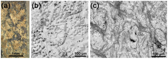 (a) Macro-photo of the area, irradiated with one pulse at 0.2 J/cm2. (b) SEM image of the sample, cleaned with 100 pulses at 0.4 J/cm2 (scale bar 100 µm). (c) SEM image if the corroded sample, irradiated with 50 pulses were needed at 0.14 J/cm2.