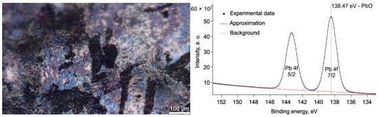 The third area is a visually dark layer adjacent to the metal (Figure 3c). Its spectrum has an intense peak with a maximum at 143 cm−1, which is close to the characteristic peak of Pb–O bonds in lead oxides. The peak shape of bands in the range of 250–400 cm−1 is slightly distorted. Data fitting of the complex contour with five Lorentzian equations allowed for the identification of two more peaks, characteristic for the lead oxide—289 and 338 cm−1. These peaks are attributed to the tetragonal modification of PbO—litharge [23].