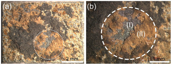 The femtosecond laser system has a constant pulse frequency of 10 Hz. To determine the threshold for metal damage, it is necessary to obtain a single crater; therefore, the sample was moved by a motorized translation stage at a 2 mm/s speed. By reducing the beam energy with a discrete attenuator, 7 crater tracks were obtained with a laser fluence of 0.07–1.10 J/cm2. With SEM studies, it was shown that the single pulse at 0.07 J/cm2 did not cause the lead to melt. When a corroded sample was irradiated at 0.07 J/cm2, no cleaning was observed. As the initial irradiation of the corrosion layer under these conditions did not reveal any sign of melting, the speed of the translation stage was reduced to 0.1 mm/s. With the size of the laser spot about 300 μm and a 10 Hz pulse frequency, there are approximately 30 laser pulses per spot. Unfortunately, the results confirmed previous laser experiments: in areas where the local removal of corrosion layers occurred, metal melting was observed (Figure 8a). Due to the differences in the nature of radiation absorption, femtosecond radiation energy is more strongly absorbed by the metal than by the oxide layer [27]. This leads to explosive melting of the metal base (see Figure 8b), although the zone of thermal effect of the fs-laser radiation is much smaller than with longer pulses.