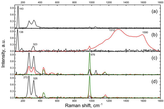 The spectrum for area I in Figure 10b has a relatively intense peak with a maximum at 138 cm−1 (Figure 11b). It is unsymmetrically broadened from the low frequency side. Compared to the spectrum for the non-irradiated lead (Figure 11a), a shift to the low-frequency area by about 5 cm−1 and an additional peak at 323 cm−1 are observed, which may be due to the thermal effect of irradiation on the lead oxide film [23]. Additionally, the spectrum in Figure 11b shows the emergence of intense bands characteristic of amorphous carbon, namely peaks D (1312 cm−1) and G (1590 cm−1): the black spectrum corresponds to the area with oxide layer and the red spectrum corresponds to the area with high amorphous carbon content. This is a typical result of organic matter undergoing thermal damage, which in the Raman spectrum of the non-irradiated lead gave weak unidentified peaks with a strong luminescence. The background was subtracted during the data processing for better visualization of the signal.