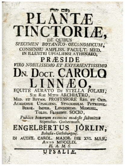 - Jörlin, E. Plantae tinctoriae (16-05-1759). In Amoenitates Academicae Seu Dissertationes Variae; Linnaeus, C., Ed.; Bahufia Gothoburgenfis: Stockholm, Sweden, 1760; Volume 5, pp. 314–342. Available online: https://transkribus.eu/r/noscemus/#/documents/913062/pages/331 (accessed on 1 April 2022).