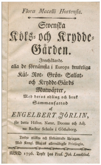 - Jörlin, E. Flora Macelli Hortensis. Swenska Köks- och Krydde-Gården. Innehållande alla de Förnämsta i Europa Brukeliga kål- rot- grön- sallat- och Krydde-Gårds Matwäxter, med deras Odling och Bruk Sammanfattad. Andra Uplagan, Förökt Och förbättrad [The Swedish Kitchen and Herb Garden. Containing All the Finest Cabbage, Root Vegetable, Salad, and Herb Garden’s Edible Plants, with Their Cultivation and Use Summarized.], (1796), 3rd edition, 1796, Facsimile. Swedish Literature Bank. Available online: https://litteraturbanken.se/om/english.html (accessed on 23 November 2022).