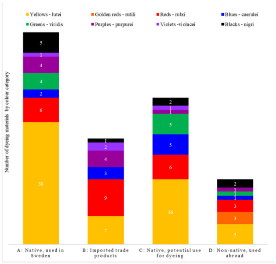 The majority of the plant species belongs to seed plants (Spermatophyta). Further, Jörlin mentions one clubmoss, seven lichens, molluscan purple, six gall insects and five dye insects: kermes, Polish cochineal, American cochineal, Indian lac and an indigenous insect found on elm trees. Some species provide more than one dye source, so he lists a total of 130 different dyeing materials: 52 from native species used in Sweden, 26 imported products, 36 materials of native origin having the potential to be used in dyeing and 16 materials of non-native species applied abroad (Figure 3). The bar chart shows that the color yellow dominates among the Swedish dye sources, while the majority of traded products are for dyeing red and purple.