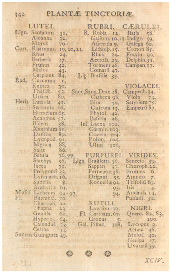 Jörlin’s thesis gives information on 130 dyeing materials, originating from 117 different plant and animal species assigned to 107 numbers. In the 5th volume of Linnaeus’ Amoenitates Academicae, the dissertation includes an index of only 102 dyeing materials (Figure 4). Some numbers differ, as can be seen from the asterisked numbers in the Tables 3–14.