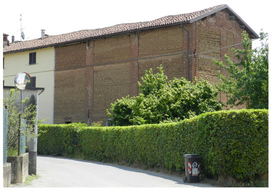 Starting from the experiences shown above and in particular from Mattone M. [29], the authors decided to carry out a new experimental campaign during which synthetic protective products (commercial and innovative) belonging to different classes (fluoroelastomers, silanes and siloxanes, and nano-silica) and natural products (oil of Aleurites) with a lower environmental impact than synthetic products were tested on earthen bricks from a rural building located near Alessandria (Piedmont region, Italy) (Figure 4). These types of architectures are not covered by render; therefore, a surface protection treatment could increase their resistance to water and, consequently, their durability, reducing their maintenance. However, it is obvious that these treatments cannot replace ordinary maintenance interventions such as making the roof and the base of the building safe, which must always be carried out periodically.