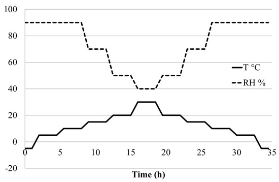 The not treated and treated earthen bricks were exposed to artificial ageing in an Angelantoni Challenge 500 Climatic Chamber. The thermo-hygrometric conditions were simulated experimentally based on the cycle represented in Figure 7. This cycle was carried out by reprocessing original data recorded by “Rete di Monitoraggio Meteoidrografica” of ARPA Piedmont in the Alessandria Lobbi weather station over ten years. The data were averaged, and one-year behaviour was converted to an RH cycle of 35 h ranging from −5 °C to 30 °C and from 40 to 90% RH. The cycle was repeated 50 times. Colorimetric change, weight, and contact angle measurements were performed before and after accelerated ageing.