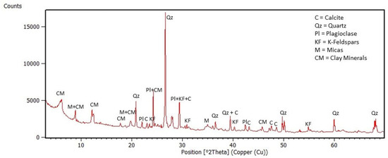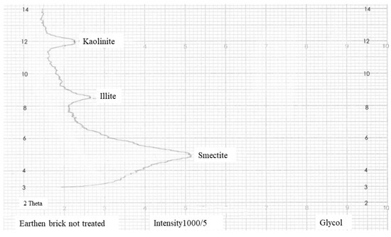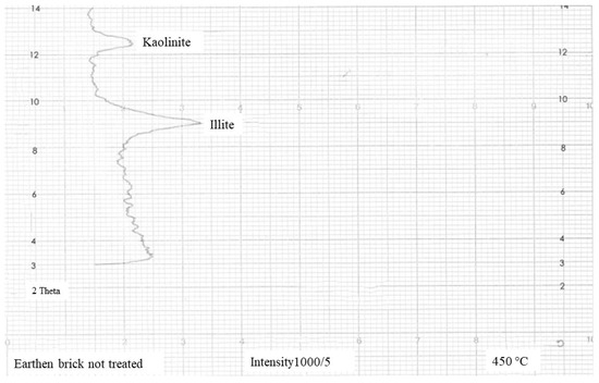 The grain size distribution of the earthen material (sand 24%, silt 45%, clay 31%) taken from the farmhouse under demolition was obtained through sieving. The main mineralogical composition of the earthen bricks, performed by X-ray diffraction, is as follows: quartz, feldspars, calcite, micas, and clay minerals (Figure 8).