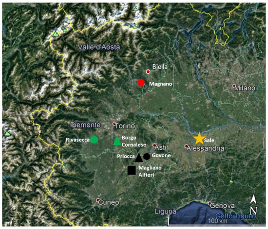 Map of areas where the earthen brick were sampled in Piedmont (from Google Earth Pro V 7.3.4, accessed on 14 December 2015, 44°54′44″ N, 08°38′20″ E, Videocamera alt 303 km, Google Landsat Copernicus data SIO, NOAA, U.S. Navy, NGA, GEBCO, modified by the authors.