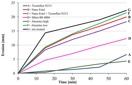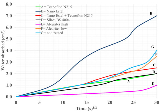 In this experimentation, products with hydrophobic properties that belonged to different categories such as synthetic polymers (fluoroelastomer, silane, and siloxane mixture), natural resins (Aleurites oil), and silica nanoparticles (nano-silica) were selected based on previous experiments by the authors [29] or tested for the first time on this kind of material (mixture of nano-silica + fluoroelastomer) [36].