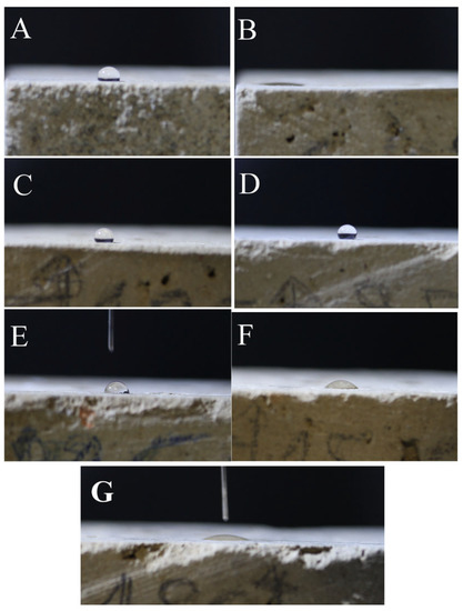 The evaluation of the hydrophobic action induced by the products was carried out according to EN 15802 [30,31] by measuring the static contact angle. The earthen brick samples were placed on a pivoting support so that the surface of the specimen was always aligned with the optical axis of the digital camera reflex (Canon EOS 7D) equipped with a macro lens (Canon EFS 60 mm). Drops of 10 μL (±0.1 μL) of distilled water were deposited on the surface of the stone sample with a micro-pipette and photographed after 15 s. The contact angle was obtained by measuring the dimensions of the drop [Ɵ = 2arctg (2 h/a), where Ɵ = contact angle in degrees; h = height of the drop; a = width of the drop at the base] performed directly on the macrophotography.
