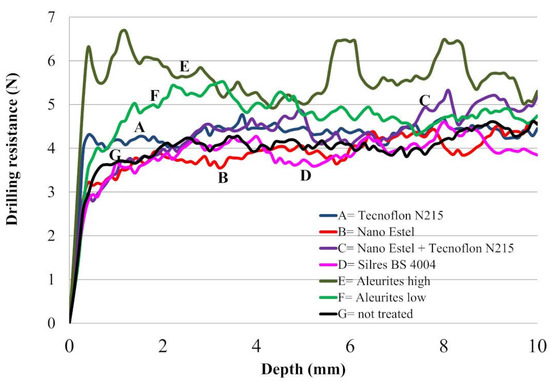 The DRMS system was used to assess the compatibility of treatments by checking the possible formation of a hard surface crust and to assess the consolidation effectiveness in the case of the combined Nano Estel + Tecnoflon N215 treatment and Nano Estel alone treatment. The system also makes it possible to verify the depth of penetration of a product, in the event that it confers a recohesion, and is therefore more appropriate for consolidating treatments. For a protective treatment, it is not necessary for the product to penetrate deeply into the material, but it must have a good surface distribution [41,42,43].The drilling resistance measurements were carried out under the following operating conditions: 200 rpm rotation speed of the bit, 10 mm/min forward speed of the bit, and 10 mm depth of the hole. A Fischer carbide-tipped masonry drill bit, for stone and concrete, with a 5 mm diameter was used.