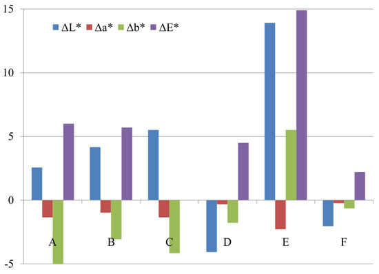 All treatments, except for D and F, showed a total variation in colour perception (ΔE) appreciable with the naked eye (ΔE > 5). In particular: