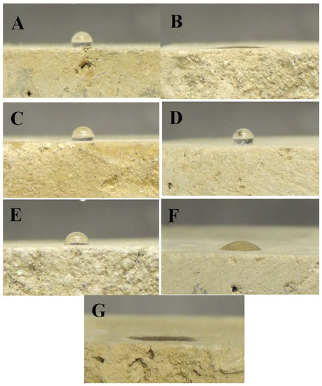 After ageing, contact angle of the earthen brick samples treated (A–F) and not treated (G). (A = Tecnoflon N215; B = Nano Estel; C = Nano Estel + Tecnoflon N215; D = Silres BS 4004; E = Aleurites high; F = Aleurites low; G = not treated) (credit: Rescic).