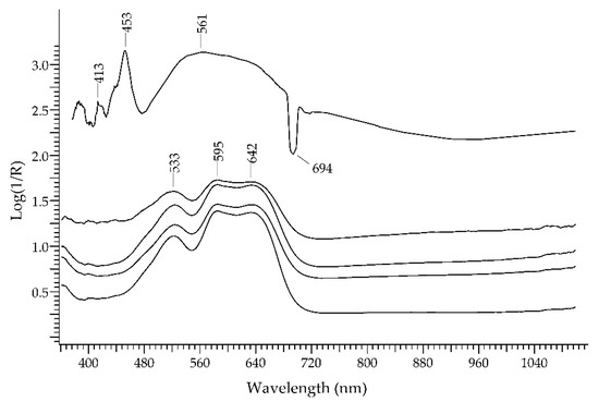 - Aceto, M.; Calà, E.; Gulino, F.; Gullo, F.; Labate, M.; Agostino, A.; Picollo, M. The Use of UV-Visible Diffuse Reflectance Spectrophotometry for a Fast, Preliminary Authentication of Gemstones. Molecules 2022, 27, 4716. [Google Scholar] [CrossRef] [PubMed]