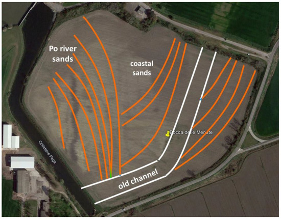 The Roman villa of Bocca delle Menate stood on littoral cord sands, near their contact, with more recent fluvial deposits of Po River (Figure 2). The Po (or Padus in Latin) valley has always been characterized as a lagoon landscape with numerous waterways and extensive area covered by rich and varied vegetation. The valley has undergone continuous evolutions and changes [19]. Clayey soils are the prevalent geology in the central area of Comacchio, where depressions and paleorivers are distributed.