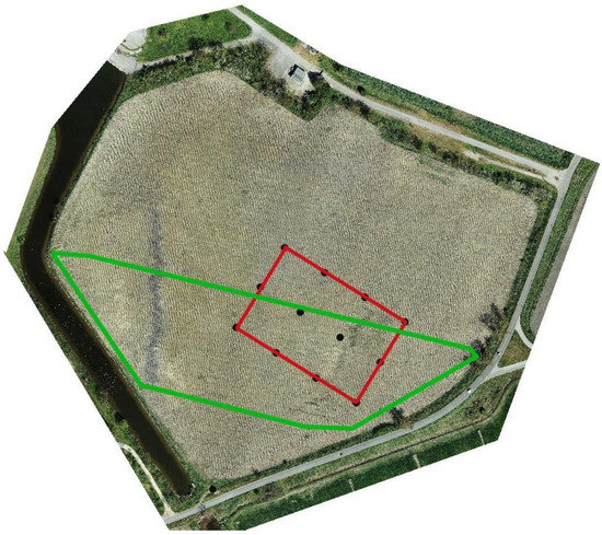Localization of the geomagnetic field area (red square) and the area investigated with electromagnetic method (green shape) on a UAV image.