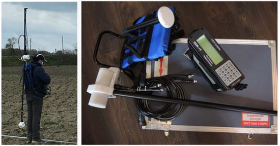 The electromagnetic survey was carried out in the archaeological area using the Profiler AMP-400 (GSSI company) (Figure 7). The system acquires the soil electrical conductivity, which is affected by the water content in soil, as well as water-soluble salt content, soil texture, coarse elements, temperature, clay content, mineralogy, cation exchange capacity, organic matter content, and bulk density [30,31,32]. It is able to simultaneously measure up to three frequencies between 1 kHz and 15 kHz, with an inter-coil spacing of 1.2 m. To gain information regarding the subsoil layers, whose frequencies were at 2, 9, and 15 kHz, were used, and instruments were set in vertical dipole mode (VDP), and the sample rate was 0.5 s. The penetration depth of any EM method is dependent upon a variety of subsurface physical properties, as well as the frequency of the inducing magnetic field produced by the Tx. The effect of these properties can be quantified using a proxy value known as the skin depth, δ, which represents the depth in the subsurface at which the field strength has decayed to 1/e (37%) of the surface value [33]: