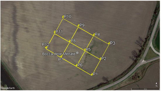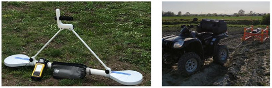 σ is the electrical conductivity (S/m), PPM(Q) is the quadrature phase (or out of phase) reading, and f is the frequency in Hz. The measurements were acquired by quad bike along the parallel inter-row of about 5 m at a speed of about 10 km h−1 (Figure 7). The electrical conductivity data were elaborated, deleting the spikes and plotting them with a kriging interpolation tool of the Surfer software (Golden Software). The in-phase components, which can be related to the magnetic susceptibility of the subsurface, are not shown because no correlation with geomagnetic data has been identified.