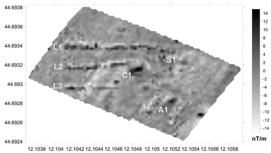 Figure 8 shows the results of the elaborated gradiometric MAG data with a kriging interpolation grid map. The obtained map highlights several anomalies with different shapes and dispositions. The gradiometric values are ranged between +40 nT/m and −45 nT/m, and several anomalies are well detected. The first group of anomalies is located on the western part, where three long parallel gradiometric anomalies are well delineated (L1, L2 and L3 on Figure 8). These linear anomalies have a direction, W-E, and a length, from 50 m to 80 m. One of the main peculiar characteristics is the constant inter-distance between each of them, with a value of about 20 m.