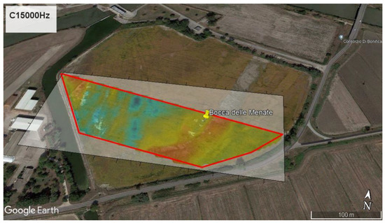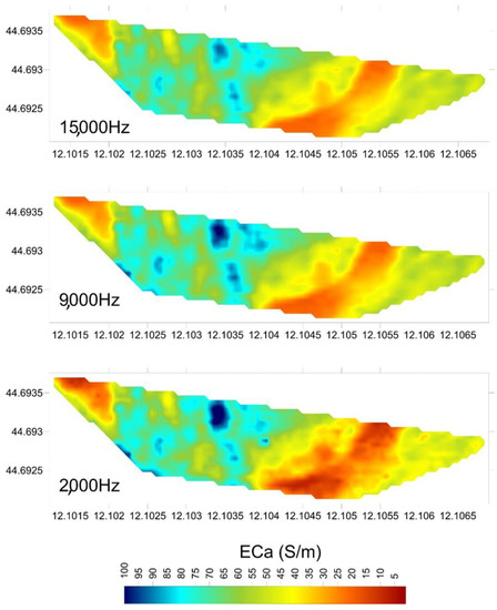 Apparent conductivity maps were obtained by acquiring different frequencies, from the lowest (2000 Hz) to the highest (15,000 Hz), indicating the different depths of investigation, as identified by the skin depth formula, according to which at the same value of electrical resistivity of the subsurface the relationship between skin depth and frequency is inversely proportional (low frequencies -> high depth of investigation; high frequencies -> low depth of investigation). Therefore, according to the above relationship, the maximum investigation depth was about 2–3 m.