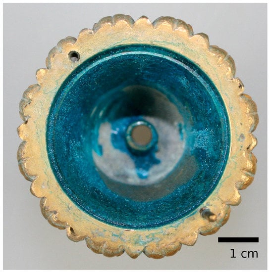 The latest example of a hitherto unknown copper formate corrosion product on heritage objects characterised structurally by XRPD was a mixed basic copper(II) zinc formate, occurring on brass in contact with glass, and, in simulation experiments: Zn(10-6x)Cu(3+6x)(HCOO)8(OH)18∙6(H2O) [50,51]. On the reflector of a miner’s lamp (Figure 7), this compound occurred together with chalconatronite. A current overview of all glass-induced metal corrosion compounds can be found in [38].